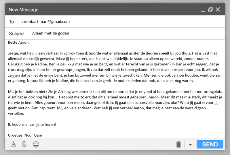 Dit citaat is tevens het credo van Aaron Bachman en Alex Boogers: het verhaal dat hun dwars zit, moest er uit. Boogers vertelt in een interview dat hij het verhaal er in nachten lang werken uitgeramt heeft. Het boek moest geschreven worden. Aaron wordt in zijn jeugd geplaagd door schimmen en beelden die hij alleen kan beteugelen door ze op te schrijven. Het is de basis voor zijn schrijverschap.